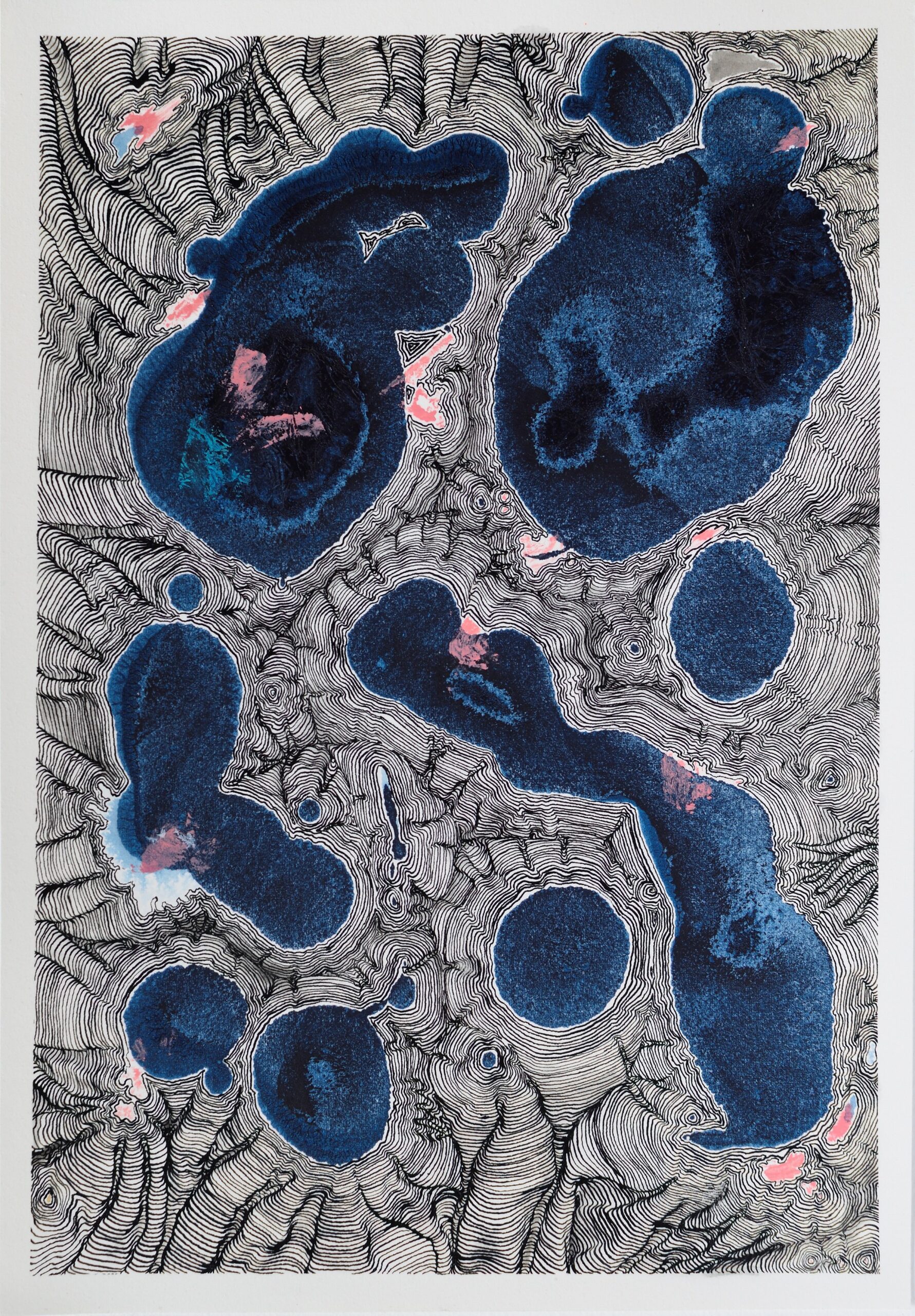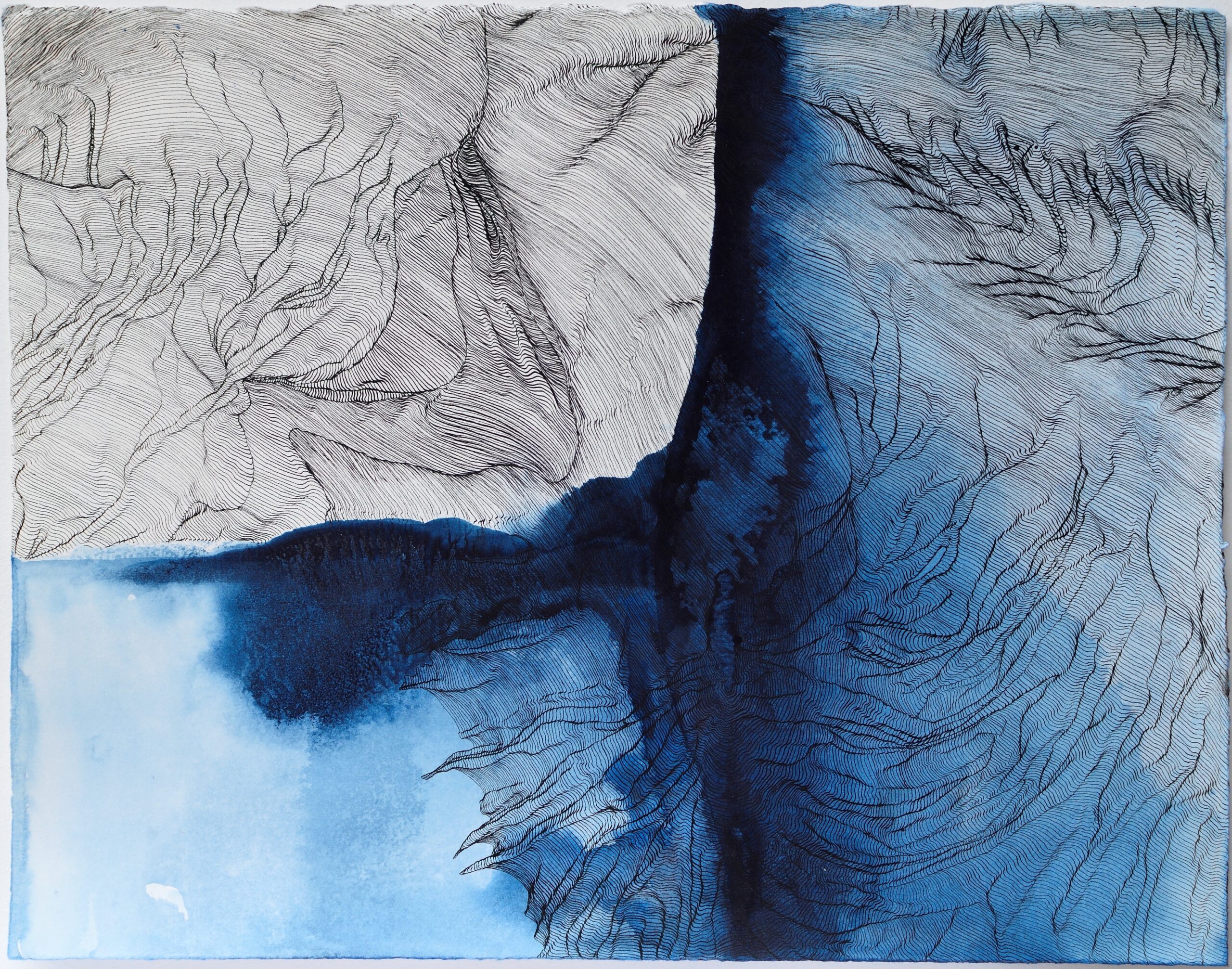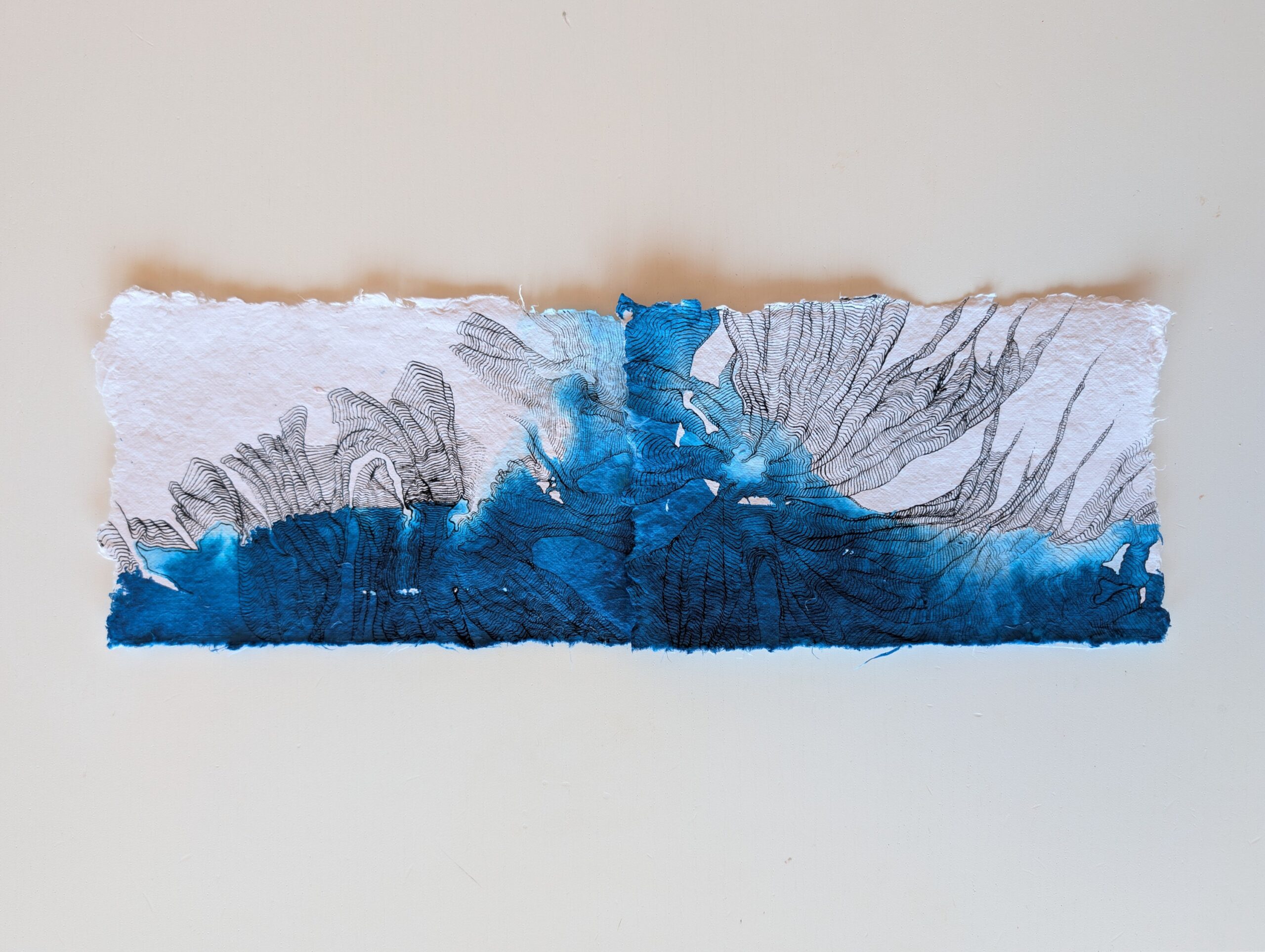 I had stretched a sheet of paper, preparing for a watercolor painting. Then, an accidental spill of indigo ink ruined the plan. For five years, the paper stayed exactly like that: stretched on a board, stained.