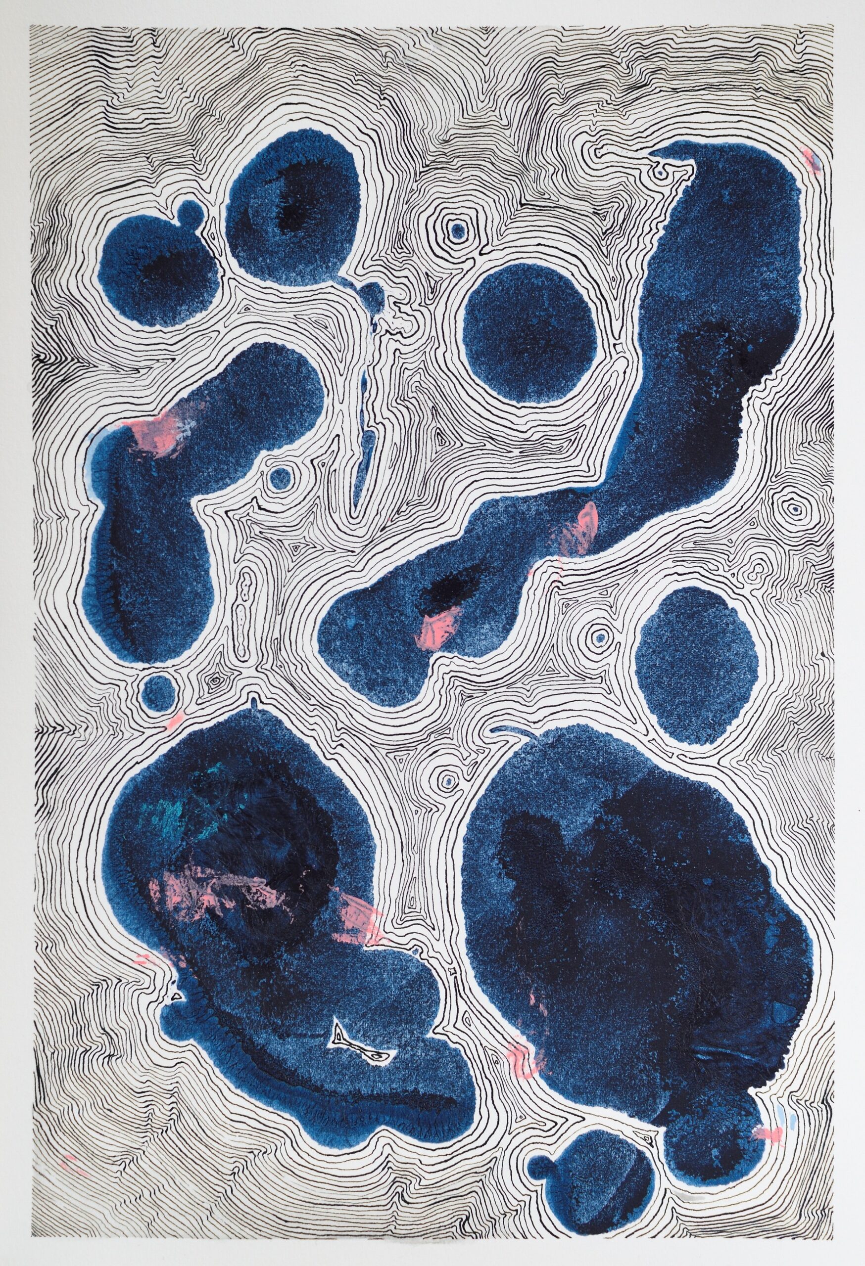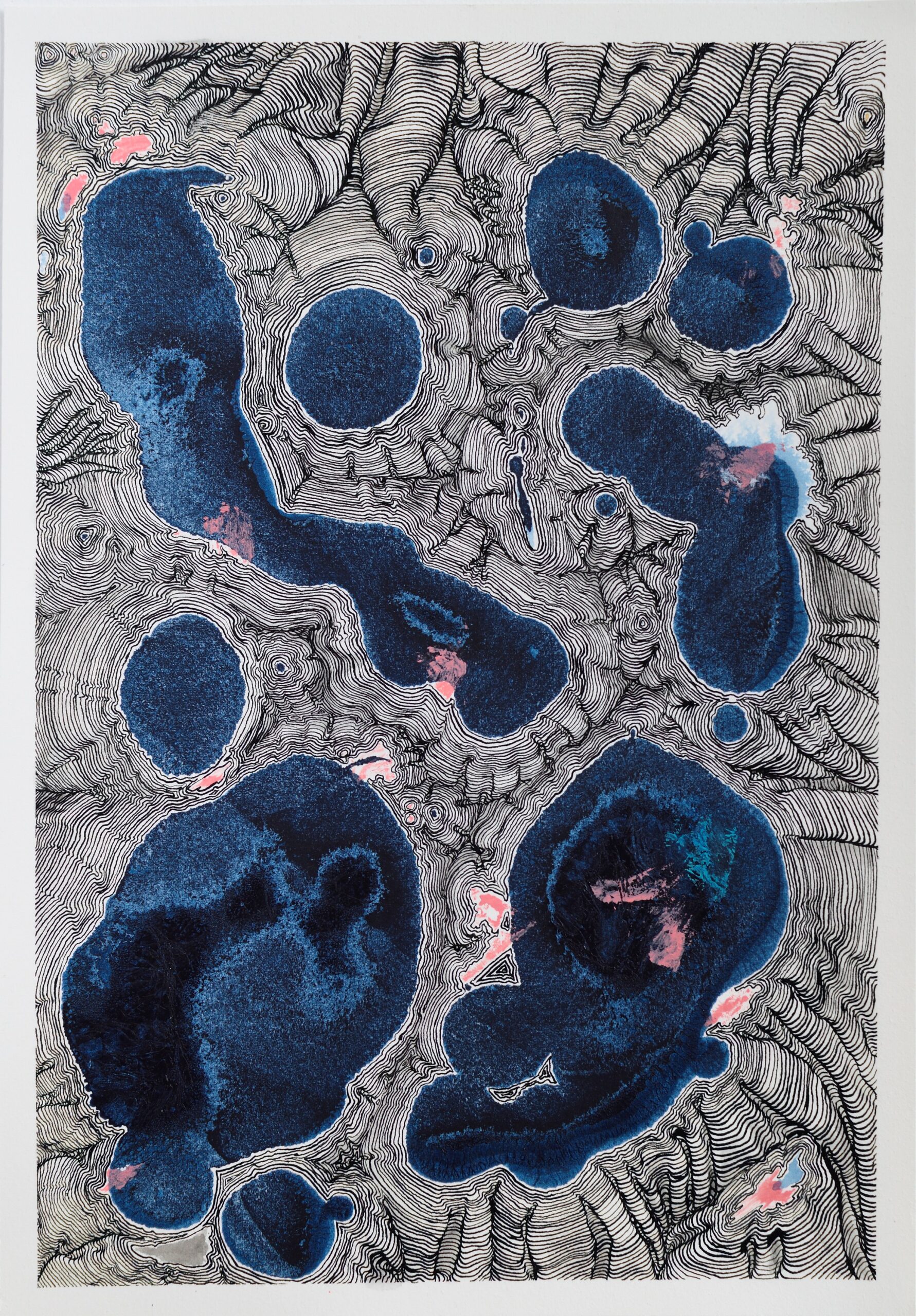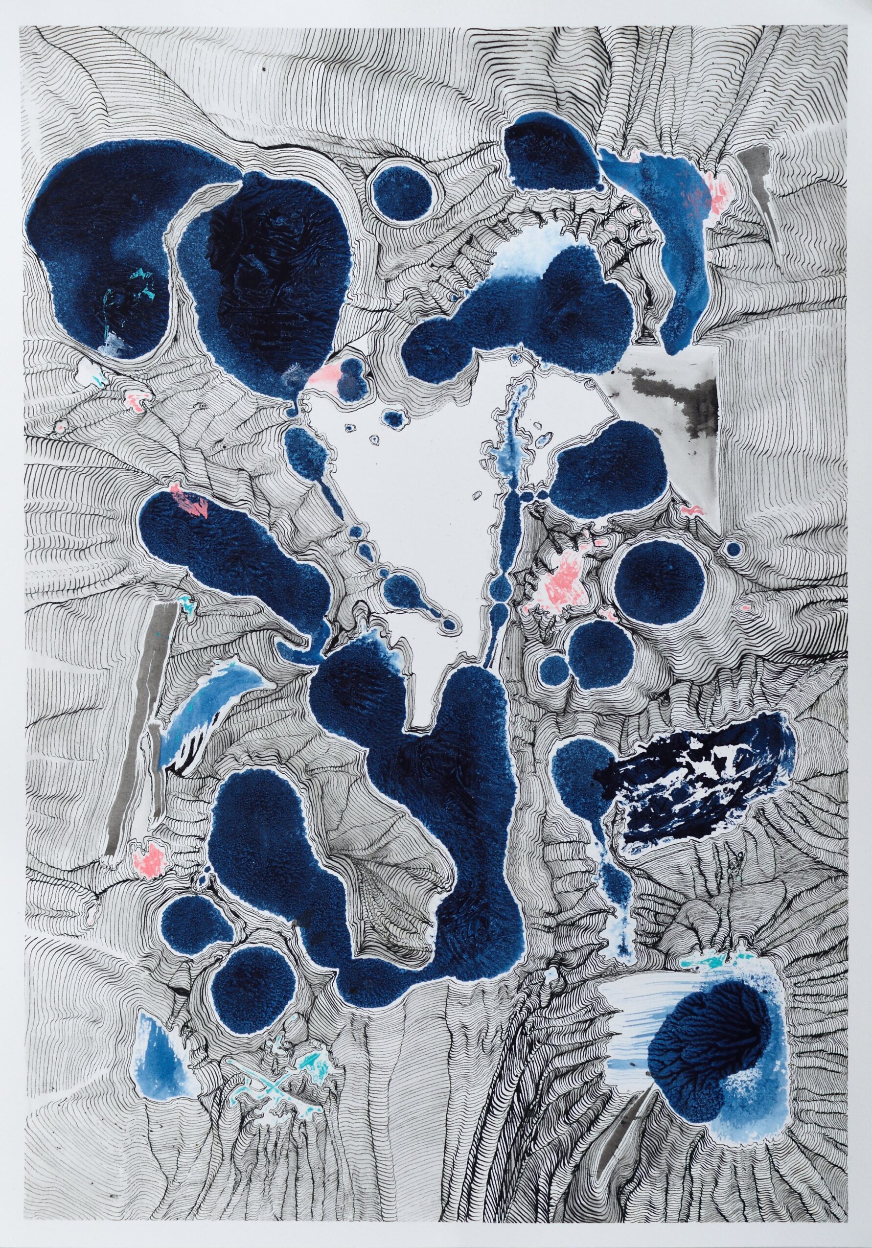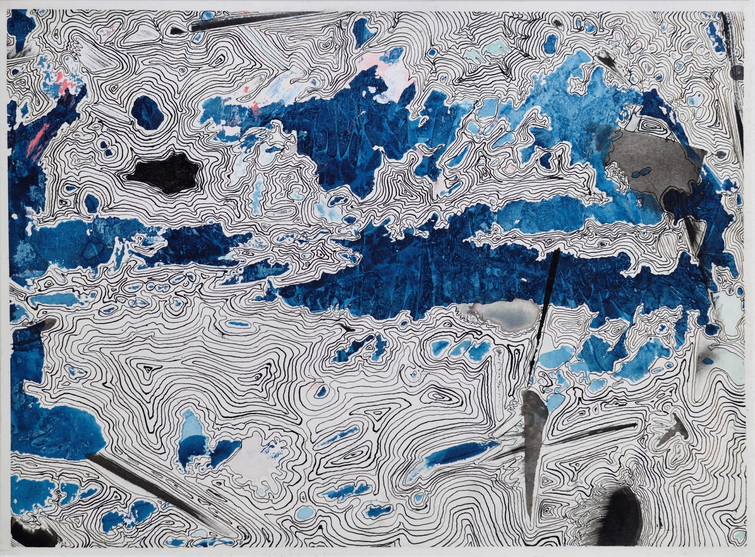 I had stretched a sheet of paper, preparing for a watercolor painting. Then, an accidental spill of indigo ink ruined the plan. For five years, the paper stayed exactly like that: stretched on a board, stained.